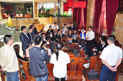 郭家荣会长(左中)与市商委的同志(右二、右三)通报大赛进行情况