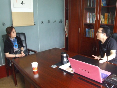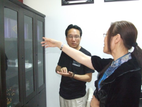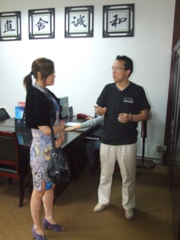 龙人养生公司李总(右)在与刘总交流