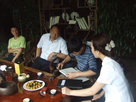 谢强副处长(右二)察看有关活动工作的记录情况