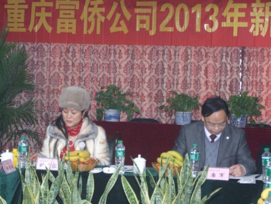重庆富侨公司负责人(左)胡芝容董事长在会议上致欢迎词