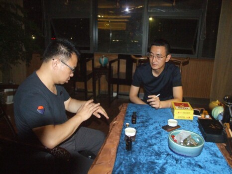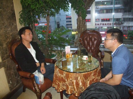 丽草源--品牌按摩精油的创始人向总(右)与重庆著名品牌--劲道足艺的牟总一起交流