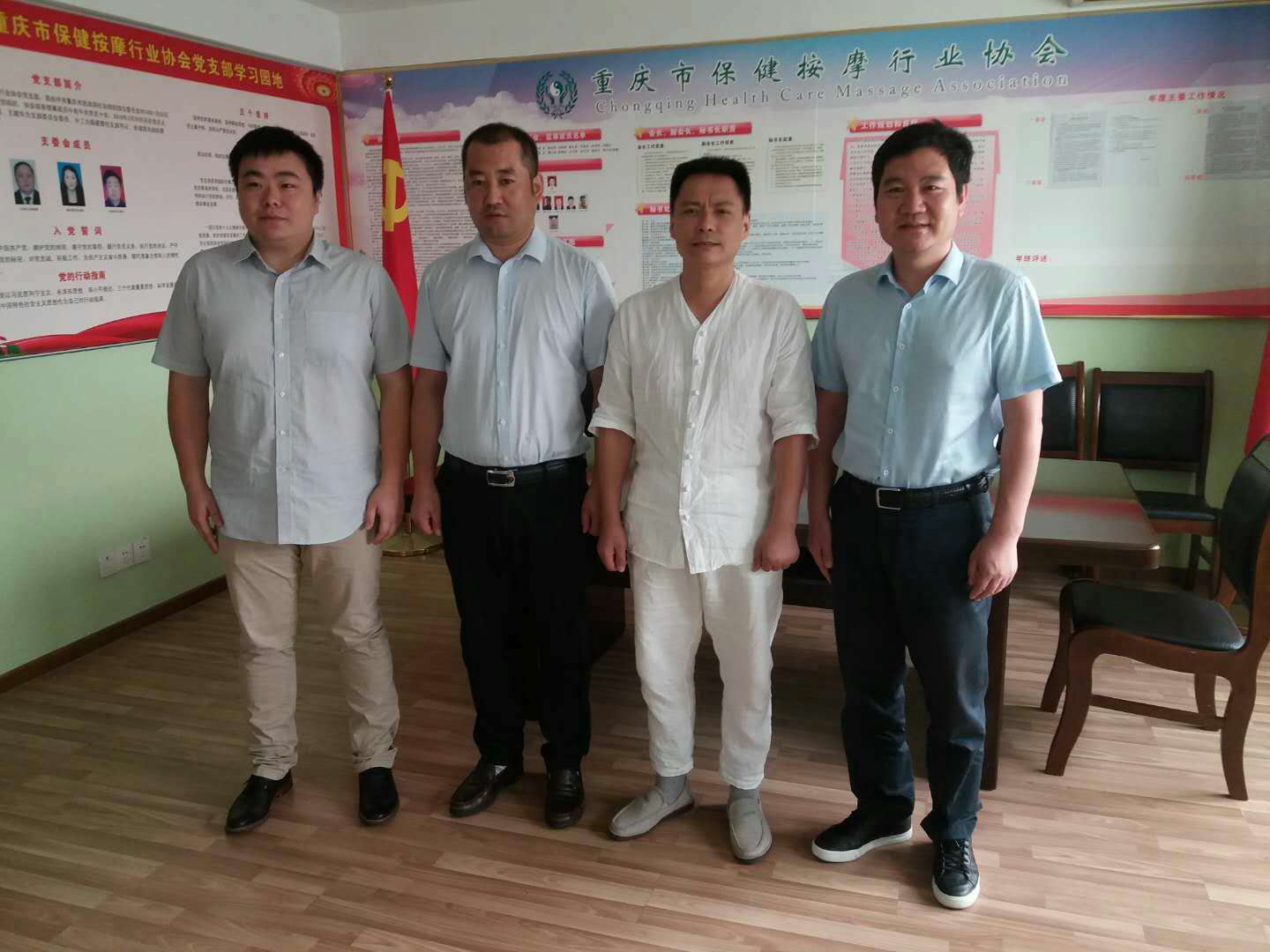 8月26日 协会党支部书记、兼秘书长薛建泰等走访会员单位九禽推拿功法研究所,并与九禽推拿功法研究所所长王正国、重庆康立中医职业培训学校校长任杰等讨论培训技能人才事宜 。