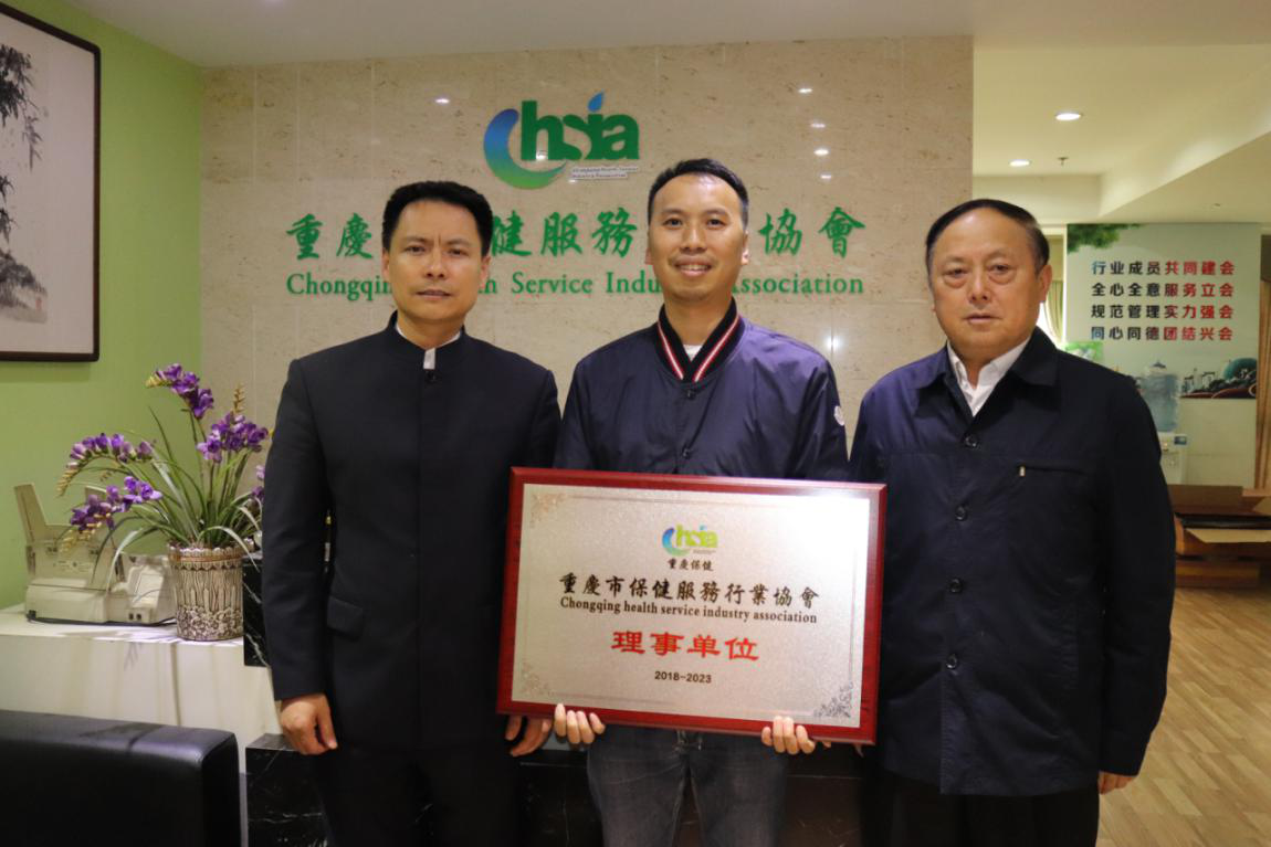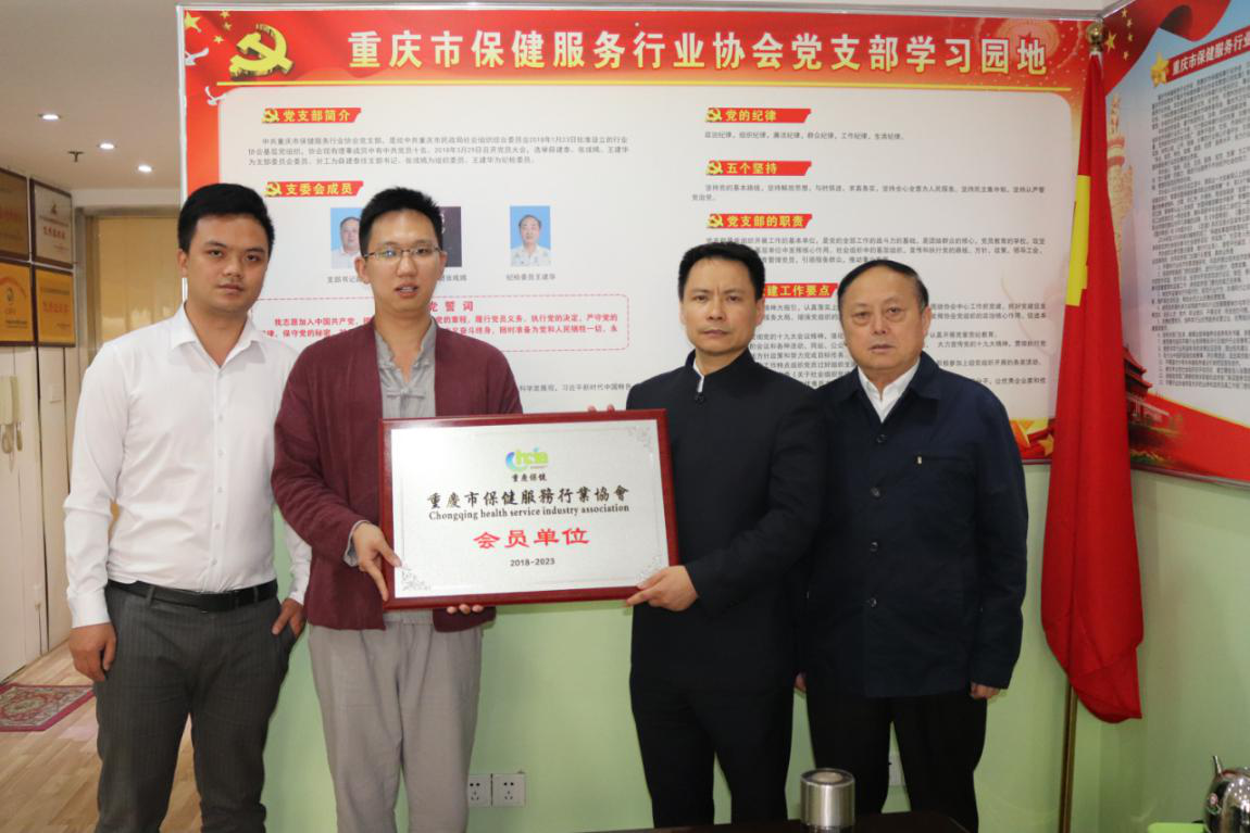 5月20日下午、会长廖家福和书记兼秘书长薛建泰为艾一生健康养生馆、重庆大宇装饰设计两个自愿申请新入会成员授牌。