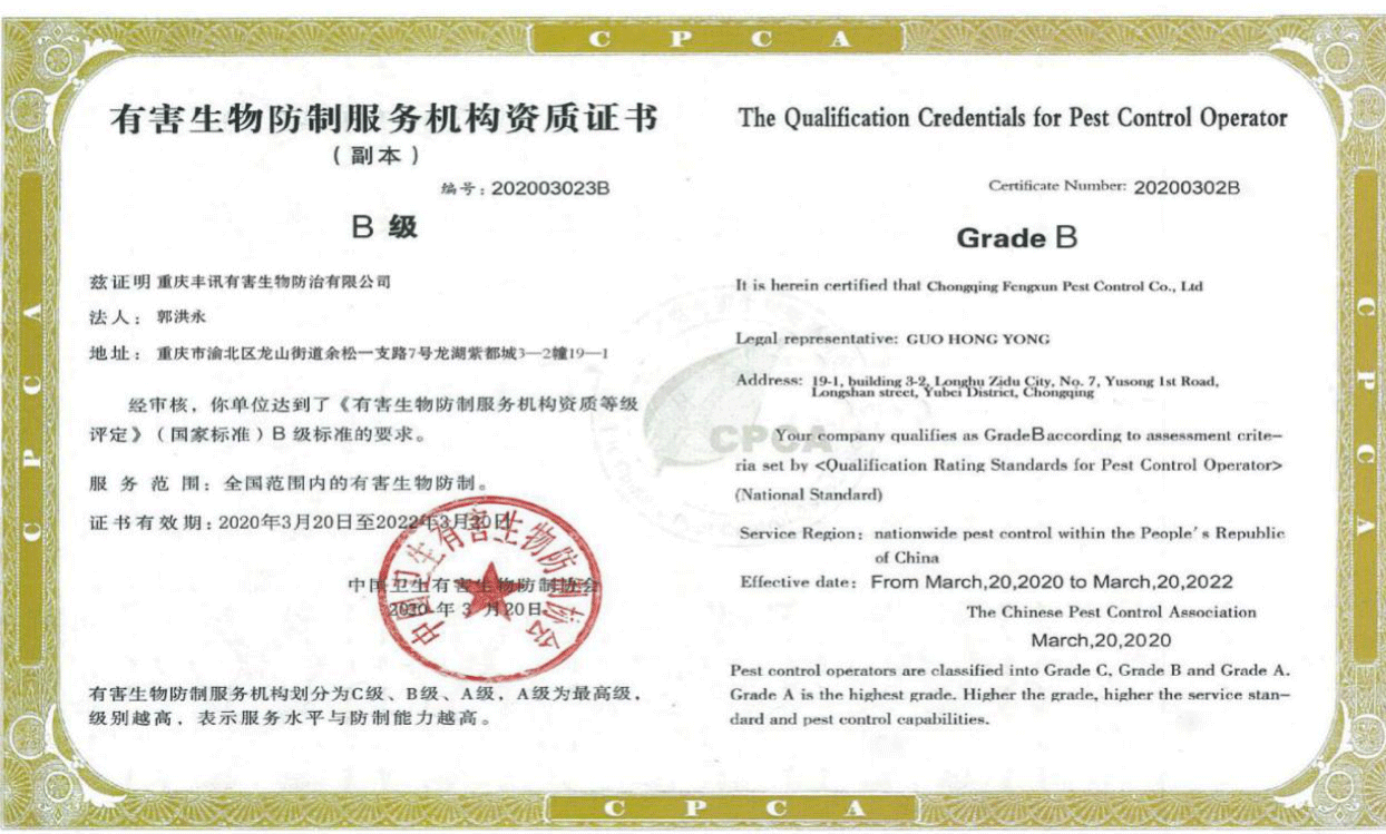 重庆丰讯有害生物防治有限公司是一家专业从事有害生物防治及保洁的综合型服务单位,通过不断的摸索和学习,现已成为一家具备行业标准的 PCO(Pest Control Operation)专业公司。公司取得国家和省级主管部门颁发的相关资质,防治对象涵盖了鼠、蟑、蚊、蝇、蚁、跳蚤、蜱虫、白蚁等各种有害生物。