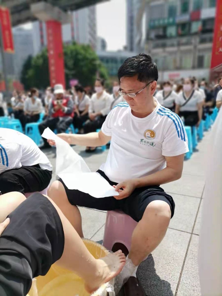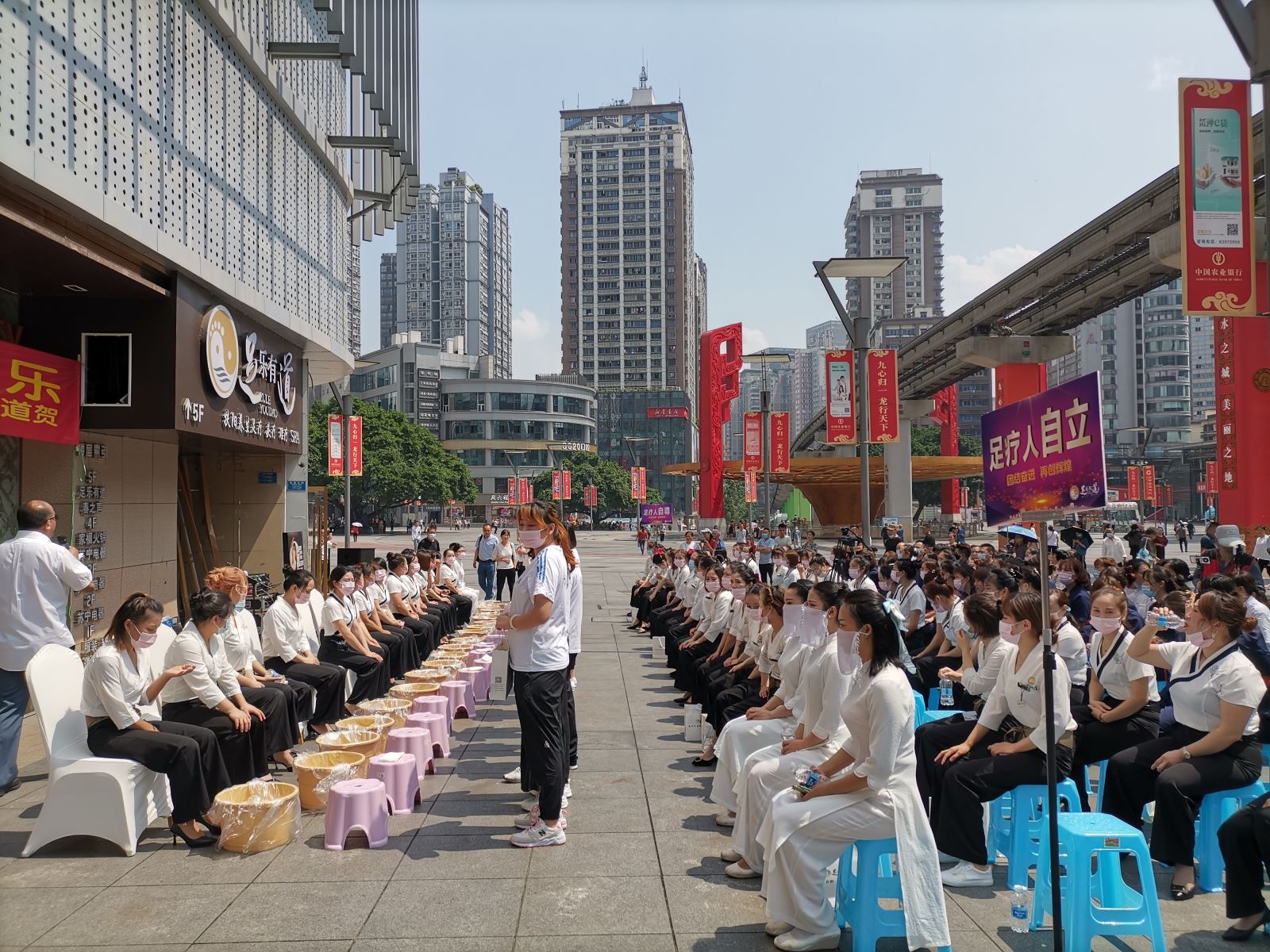 5月18日,是全国技师节,保健服务行业各会员企业纷纷组织,以不同形式开展庆祝活动。理事单位重庆足乐有道健康管理公司,在杨家坪步行街开展的活动别具特色。他们以全员团体操开始,200名员工全体参加。技师节是技师的节日,公司为每位技师准备了一份温馨的礼物,特别是公司管理团队的人员为全体技师和工勤人员洗脚活动,成为活动的高潮,公司董事长聂勋伦带头,连续为3位技师洗脚,尊重技师从管理人员做起,尊重技师从公司高管做起。