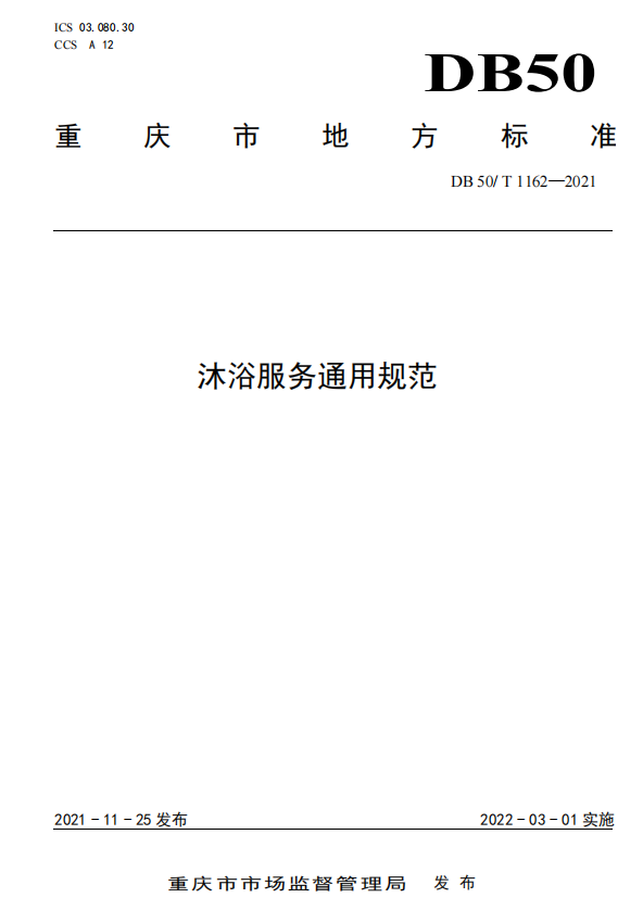 为加强重庆市沐浴服务质量,规范行业管理,提高从业人员荣誉感和社会责任感,促进重庆社会经济发展,受市商务委委托,经市市场监督管理局同意,重庆市保健服务行业协会牵头组织相关行业单位和专家,共同制定了重庆市《沐浴行业服务规范》地方标准。经市市场监督管理局批准,该标准于2021年11月25日发布,2022年3月1日开始实施。