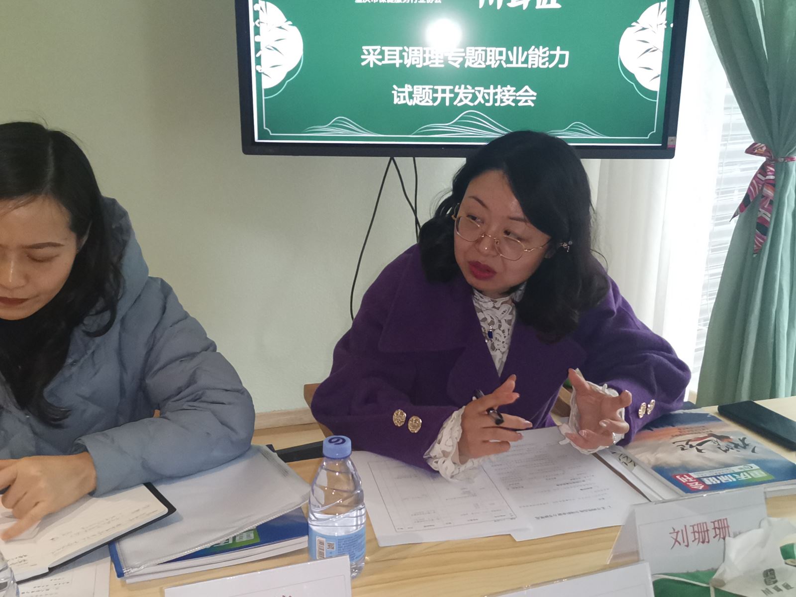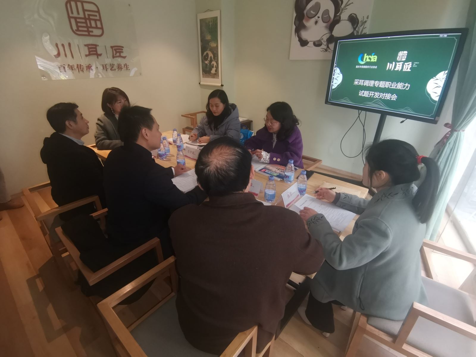 2022年2月17日,重庆市保健服务行业协会在采耳专委会主任单位——川耳匠公司总部会议室召开了“采耳调理专项职业能力试题开发对接会”,重庆市人社局职业鉴定指导中心题库科刘珊珊科长、毛学英调研员到会进行了具体指导。