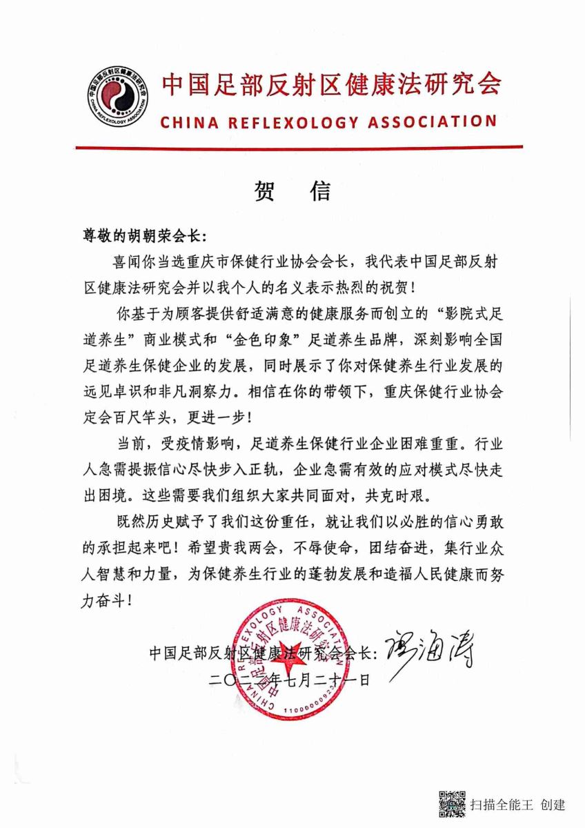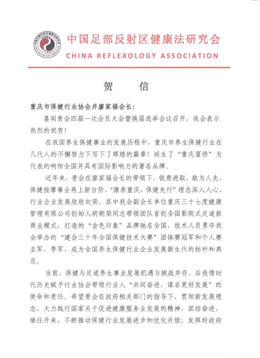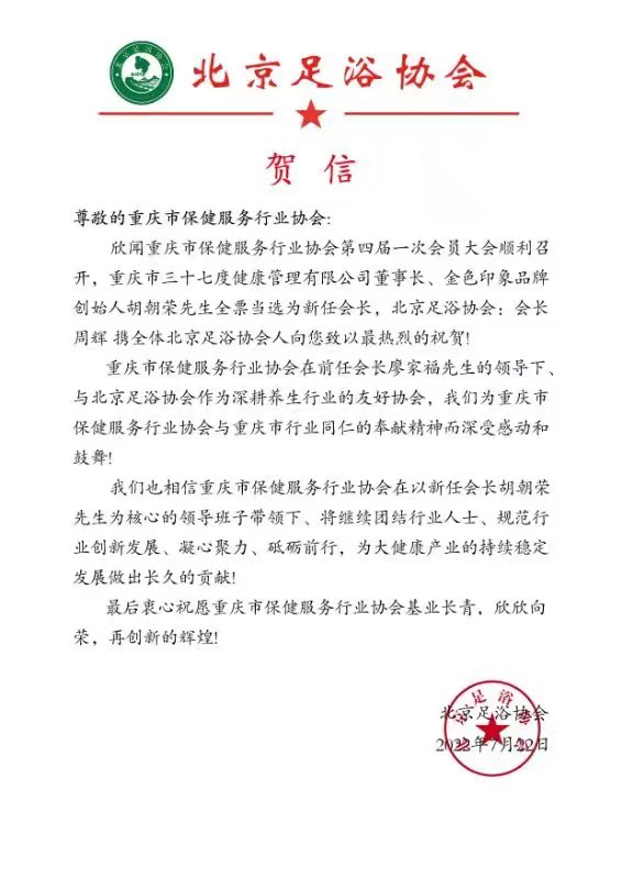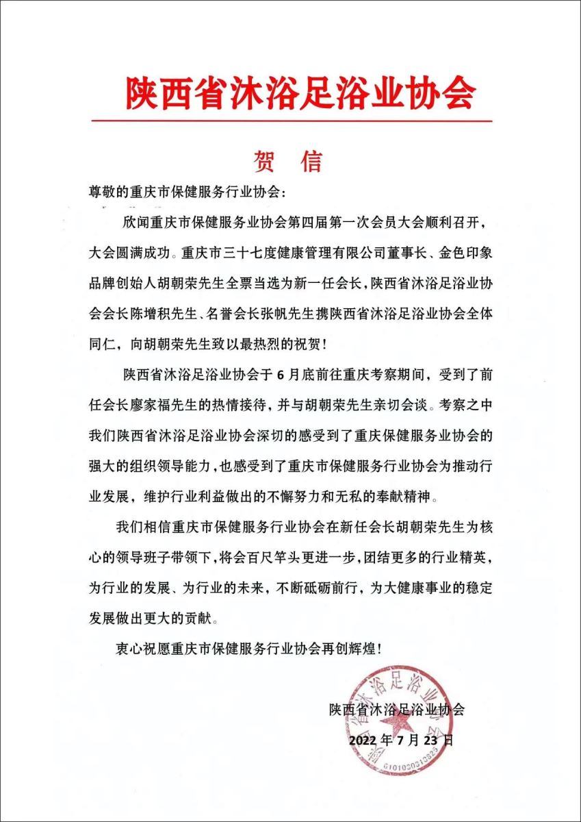 2022年7月21日,重庆市保健服务行业协会召开第四届一次会员大会,圆满完成了换届选举工作,“金色印象”品牌创始人、重庆三十七度健康管理有限公司董事长 胡朝荣当选 为新一届会长。来自中国足部反射区健康法研究会、中国商业联合会沐浴专业委员会及全国的友好协会(单位)纷纷写来贺信表示祝贺。