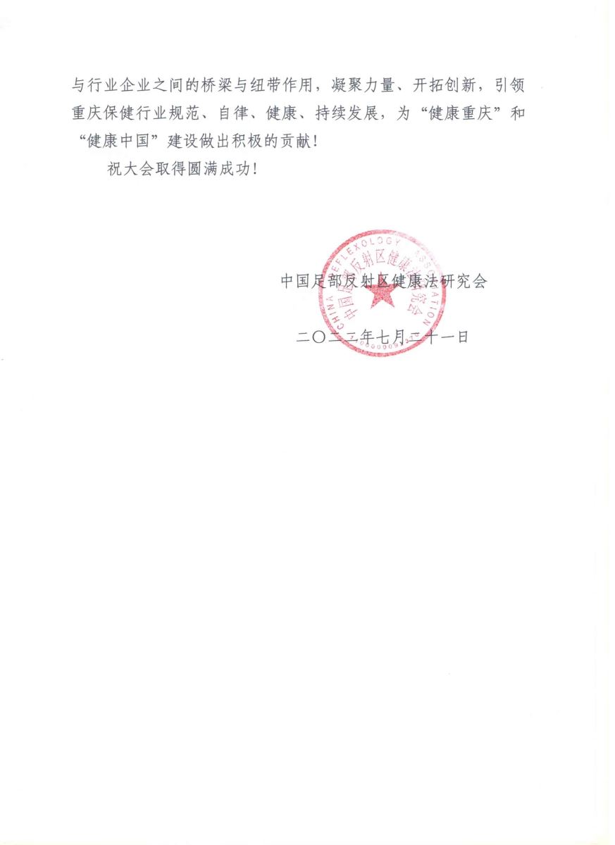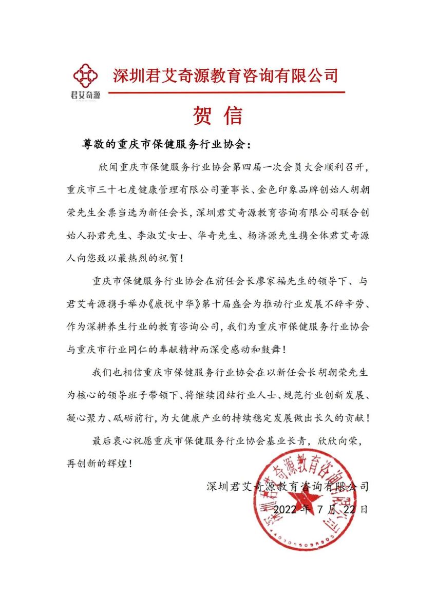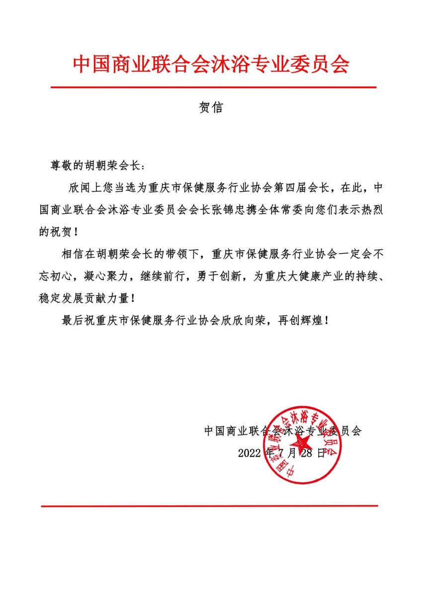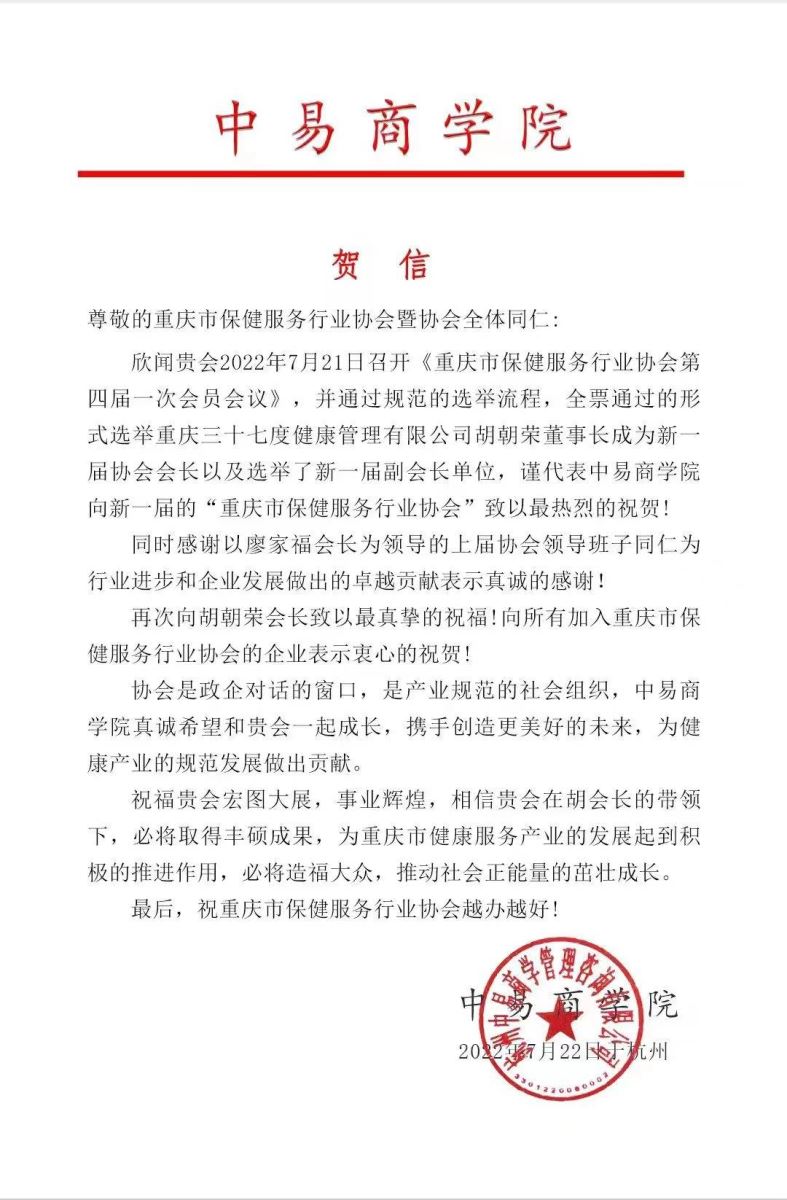 2022年7月21日,重庆市保健服务行业协会召开第四届一次会员大会,圆满完成了换届选举工作,“金色印象”品牌创始人、重庆三十七度健康管理有限公司董事长 胡朝荣当选 为新一届会长。来自中国足部反射区健康法研究会、中国商业联合会沐浴专业委员会及全国的友好协会(单位)纷纷写来贺信表示祝贺。