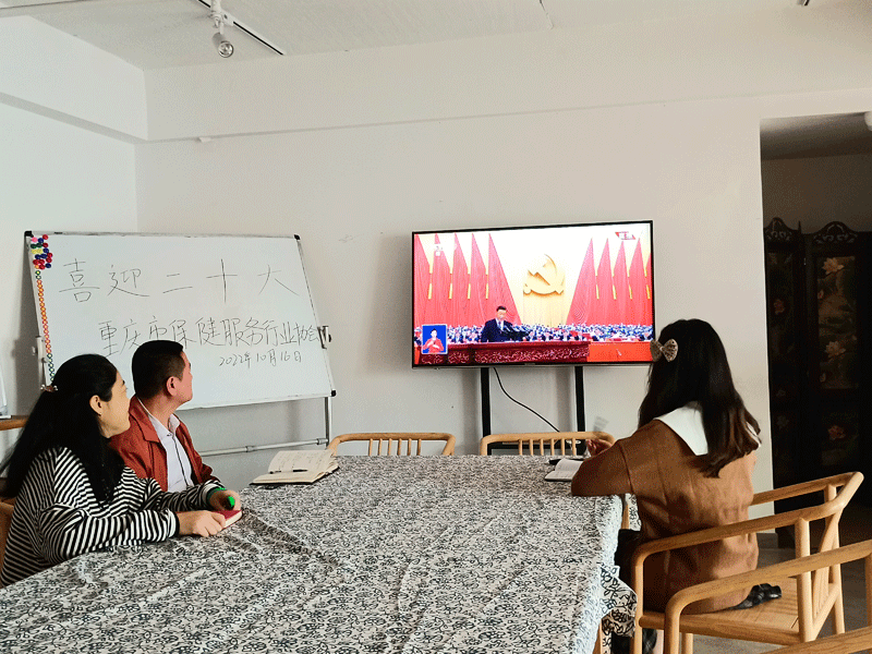 2022年10月16日上午10时,中国共产党第二十次全国代表大会在人民大会堂庄严开幕。习近平总书记代表十九届中央委员会向大会作了题为“高举中国特色社会主义伟大旗帜,全面贯彻新时代中国特色社会主义思想,弘扬伟大建党精神,自信自强、守正创新,踔厉奋发、勇毅前行,为全面建设社会主义现代化国家、全面推进中华民族伟大复兴而团结奋斗”的报告。重庆市保健服务行业协会党支部积极组织协会党员、协会全体负责人、会员及秘书处工作人员,认真收看了开幕式直播,聆听了习总书记工作报告。
