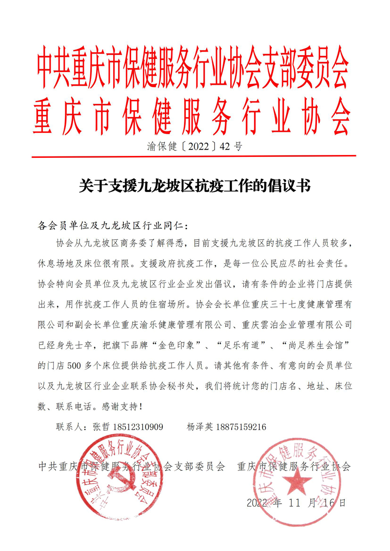 协会从九龙坡区商务委了解得悉,目前支援九龙坡区的抗疫工作人员较多,休息场地及床位很有限。支援政府抗疫工作,是每一位公民应尽的社会责任。协会特向会员单位及九龙坡区行业企业发出倡议,请有条件的企业将门店提供出来,用作抗疫工作人员的住宿场所。协会会长单位重庆三十七度健康管理有限公司和副会长单位重庆渝乐健康管理有限公司、重庆雲泊企业管理有限公司已经身先士卒,把旗下品牌“金色印象”、“足乐有道”、“尚足养生会馆”的门店 500 多个床位提供给抗疫工作人员。