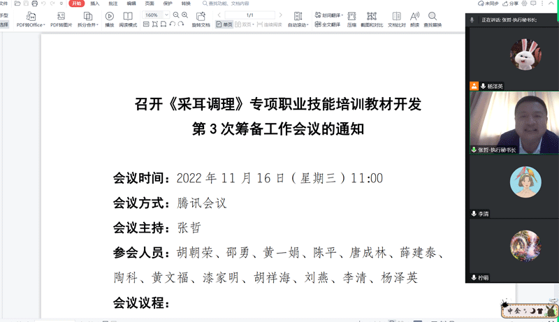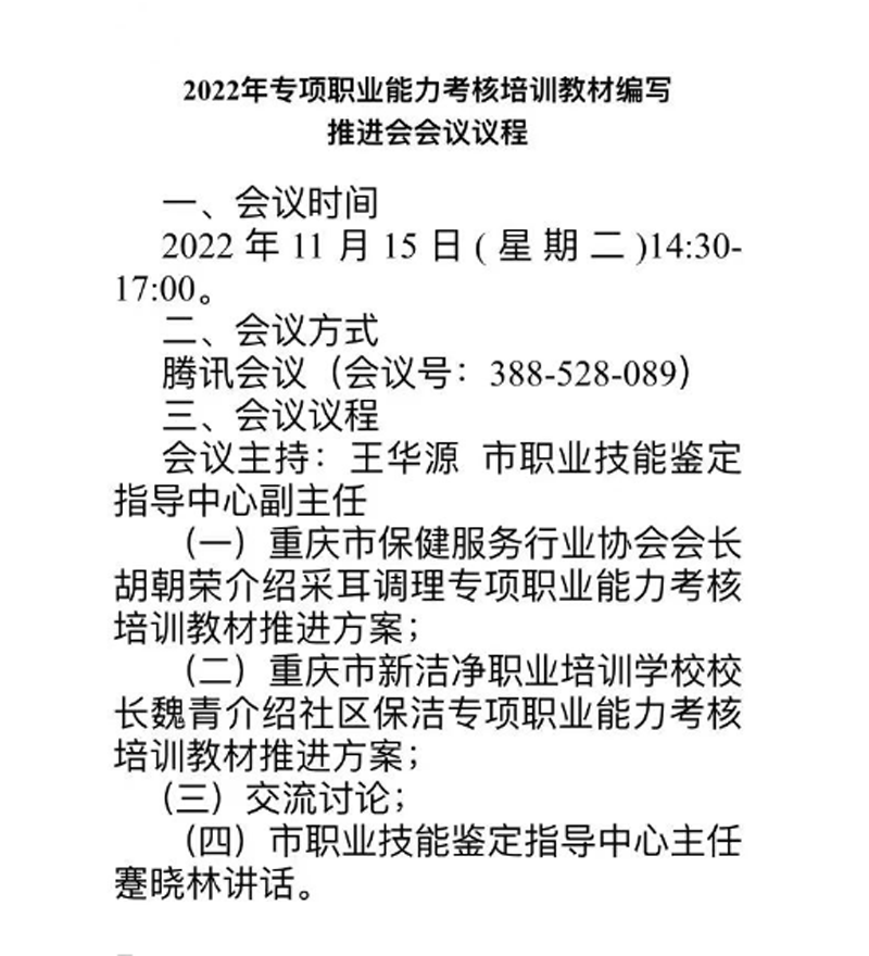 会议结束后,为贯彻落实启动会精神,协会于11月15日参加了重庆市职业技能鉴定指导中心在腾讯会议组织召开的《2022年专项职业能力考核培训教材编写推进会》线上会议,并于11月14日至16日先后组织了3次筹备工作会议。